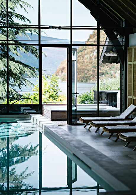 The experience continues throughout the Auberge: the intimate, softly lit Marius Bar, the two‑star Jean Sulpice gastronomic restaurant, and the glass-roofed 1903 facing the Roc de Chère. For longer stays, 22 five‑star rooms and suites on the shores of Lake Annecy, open to the water and mountains, along with a spa and its panoramic pool with treatments available on request.